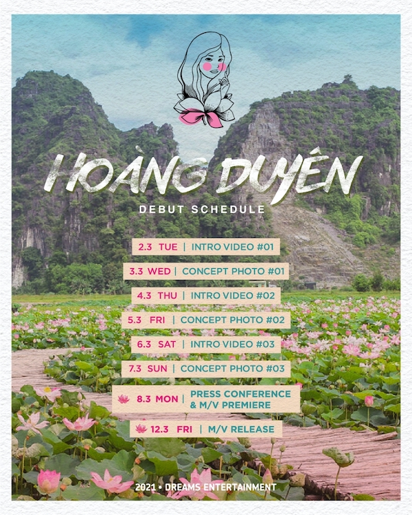 Kèm theo intro video #01, lịch chào sân của Hoàng Duyên được công bố cụ thể, chi tiết với chuỗi intro video, concept photo và sự kiện họp báo vào ngày Quốc tế Phụ nữ 8/3 trước khi M/V lên sóng – lúc 19 giờ ngày 12/3. Sự chuyên nghiệp của DreamS Entertainment còn thể hiện ở việc mời cả họa sỹ Sith Zam (Châu Trọng Hiếu) – một trong những nghệ sỹ minh họa nổi tiếng nhất hiện nay – thiết kế biểu tượng Thiếu Nữ Hoa Sen gắn liền với Hoàng Duyên suốt quá trình hoạt động nghệ thuật.