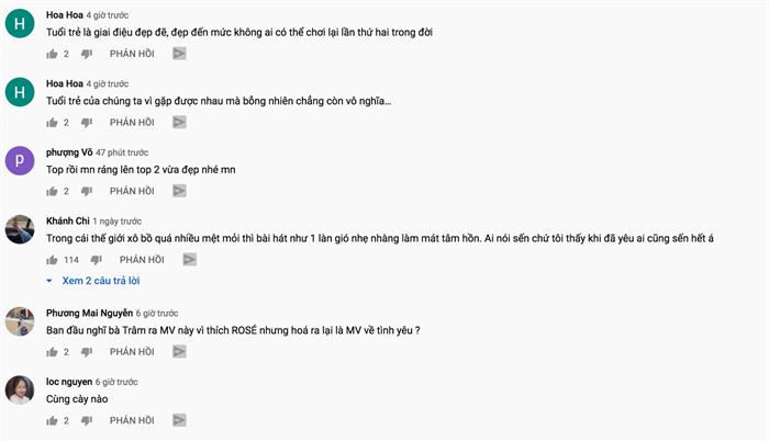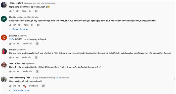Câu chuyện Thiều Bảo Trâm ngây ngô theo đuổi “Crush” Hải Nam ở MV này khiến cộng đồng mạng cảm thán: “Muốn thoát kiếp FA quá”, “Xem xong MV muốn đi tìm người yêu”, “MV khiến mình nhớ lại thời mới cảm nắng người yêu”, “Càng nghe càng thấy dễ thương, giống như mối tình đầu vậy”, “Trong thế giới xô bồ quá nhiều mệt mỏi thì bài hát này như làn gió tưới mát tâm hồn. Ai nói sến chứ tôi thấy khi đã yêu rồi ai cũng sến hết á”... Có những khán giả bày tỏ sự hoài niệm về thuở mới biết yêu khi xem MV và tủm tỉm cười thấy mình của những ngày còn trẻ trong câu chuyện.