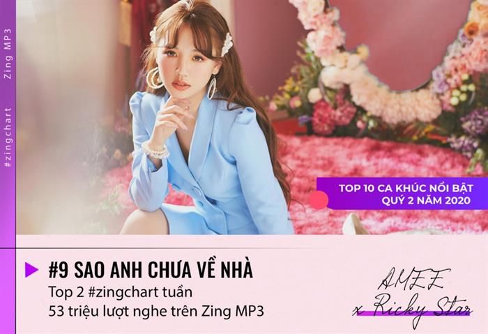 AMEE là “bóng hồng” duy nhất trong danh sách. Sao anh chưa về nhà đánh dấu sự trở lại của 10X sau khi thắng giải Phát hiện của năm tại Zing Music Awards (ZMA) 2019. Bản hit thâu tóm top 2 #zingchart tuần, đạt 53 triệu lượt nghe trên Zing MP3.