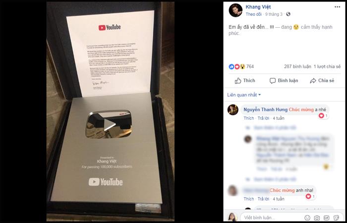 Khang Việt “đập hộp” giải thưởng Nút Bạc YouTube trên trang cá nhân vào ngày 8/3