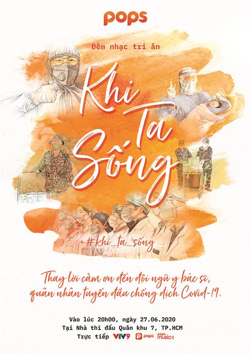 Đó cũng là lý do POPS tổ chức Đêm nhạc tri ân “Khi ta sống” như một lời cảm ơn chân thành nhất đến đội ngũ y bác sĩ, quân dân tuyến đầu chống dịch Covid. Lần đầu tiên hơn 1000 y bác sĩ, quân nhân, đội ngũ tình nguyện viên – những người đã và đang “trực chiến” với đại dịch Covid -19 sẽ có những giây phút tạm nghỉ ngơi, cùng thưởng thức âm nhạc và trải lòng về những câu chuyện thật nhất từ những ngày đương đầu cùng cộng đồng “căng mình” chống dịch. Chương trình có sự tham gia của nhiều nghệ sỹ hàng đầu Việt Nam cùng với một số khách mời đặc biệt cùng sẻ chia những câu chuyện và lan toả những thông điệp tích cực tới cộng đồng thông qua chương trình được diễn ra vào lúc 20h ngày 27/6/2020 tại Nhà Thi Đấu Quân Khu 7 và truyền hình trực tiếp trên VTV9, Ứng dụng POPS và Kênh YouTube POPS Music.