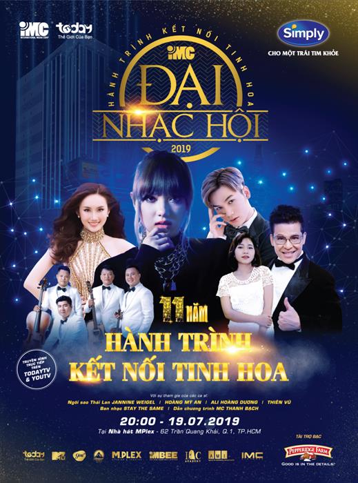 Mở màn cho chuỗi Đại nhạc hội IMC 2019 là đêm nhạc đặc sắc đầu tiên được diễn ra vào lúc 20h00 ngày 19/07 tạiNhà hát Mplex-IMC, số 62 Trần Quang Khải, Quận 1, TP.HCM. Đêm nhạc đầu tiên với sự tham gia của các ca sĩ trẻ đang được yêu thích tại Việt Nam như: Hoàng Mỹ An, Ali Hoàng Dương, Thiên Vũ, ban nhạc Stay the same, cùng người dẫn chương trình MC Thanh Bạch. Đêm nhạc mừng sinh nhật 11 năm IMC- TodayTV sẽ được truyền hình trực tiếp trên TodayTV vào lúc 20h00 ngày 19/07/2019. Sự kiện mừng sinh nhật 11 năm IMC- TodayTV “Hành trình kết nối tinh hoa” với sự đồng hành chính của Nhãn hàng dầu ăn cao cấp Simply và nhà tài trợ bạc: Công ty TNHH Thực Phẩm Ân Nam –Nhãn hàng bánh Pepperidge Farm.