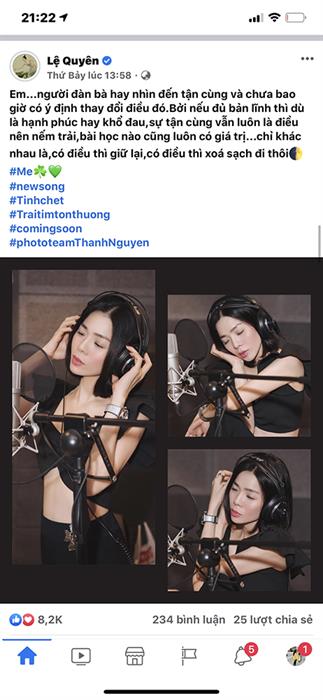 Xuất hiện ở phòng thu Viết Tân, Lệ Quyên gây ấn tượng với hình ảnh tối giản, trang phục cắt xẻ ấn tượng, khoe trọn vòng eo con kiến. Nữ ca sỹ khi chia sẻ những hình ảnh chuẩn bị cho sản phẩm mới đã nhận được hàng tram bình luận và gần 9 ngàn lượt yêu thích khi chỉ vừa hé lộ tên ca khúc: Tình chết, Trái Tim Tổn Thương,…