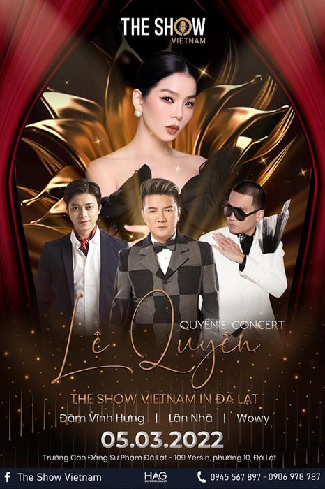 Tintuc - Tối 23/1, The Show Vietnam chính thức công bố đêm nhạc của “Nữ hoàng phòng trà” Lệ Quyên với chủ đề Quyên’s Concert cùng 3 vị khách mời đặc biệt: “Ông hoàng nhạc Việt” Đàm Vĩnh Hưng, nam ca sĩ Lân Nhã và Wowy – “Lão Đại” của Rap Việt.