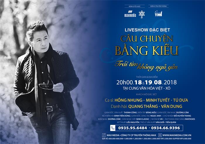 Bên cạnh Minh Tuyết, live show Bằng Kiều còn có sự góp mặt của Bằng Kiều, Tú Dưa và hai danh hài Vân Dung, Quang Thắng. Từng đánh dấu thành công với những live show chất lượng, Max Media tiếp tục đồng hành cùng Bằng Kiều với đêm nhạc kể về cuộc đời mình lần này. Theo đó, Câu chuyện Bằng Kiều: Trái tim không ngủ yên – sẽ diễn ra 2 đêm liên tiếp vào 20h00 ngày 18&19/8/2018 tại Cung Văn hóa Hữu nghị Việt Xô, 91 Trần Hưng Đạo, Hà Nội.