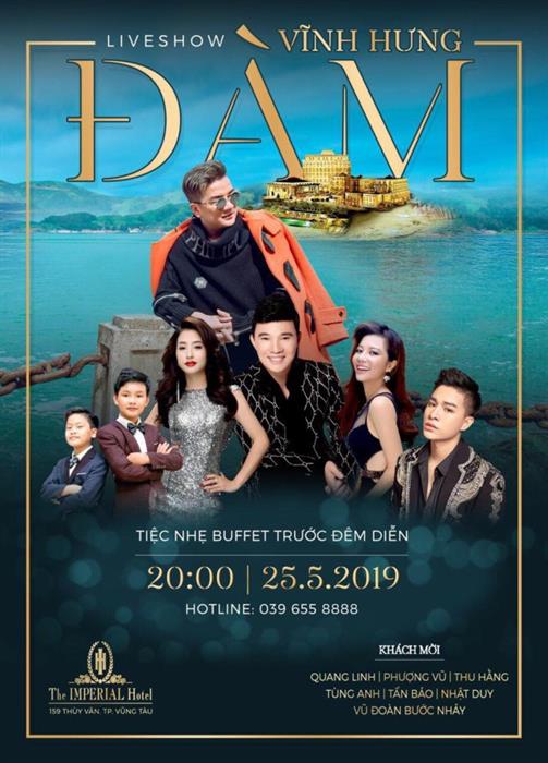 Vừa tung “chiến mã” MV Vợ tương lai làm mưa làm gió trên Youtube, Đàm Vĩnh Hưng lại rục rịch chuẩn bị tổ chức đêm nhạc cá nhân tại khách sạn Imperial Vũng Tàu vào ngày 25/5 sắp tới. Có thể thấy, Mr. Đàm chưa lúc nào chịu an phận “ngồi yên” mà luôn tràn đầy năng lượng, tích cực hoạt động âm nhạc phục vụ các fan thân yêu của mình.Được biết, show diễn chia làm 2 phần: tiệc trà và âm nhạc, với sự tham dự của các đồng nghiệp thân thiết của anh trong nghề như: Quang Linh, Phượng Vũ, Thu Hằng…
