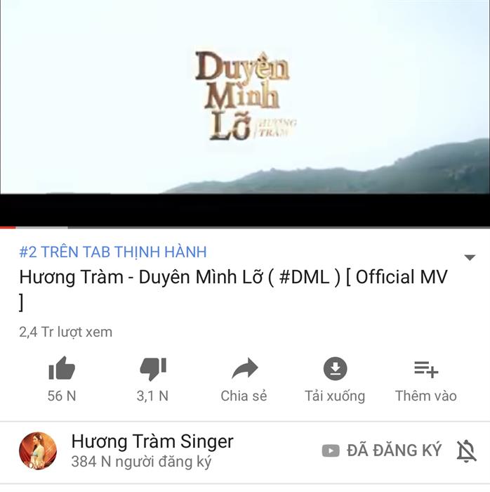 Sau siêu hit Em gái mưa, Hương Tràm chính thức cho ra mắt dự án ballad lớn nhất năm 2018 – MV Duyên Mình Lỡ vào lúc 20h ngày 29/6/2018. Chỉ sau 1 ngày phát hành, MV đang nhận được sự đón nhận của khán giả và nhanh chóng đạt hơn 2 triệu lượt view và lọt top 2 thịnh hành trên youtube. Bên cạnh đó, Duyên Mình Lỡ còn chạy đua với những vị trí ấn tượng tại nhiều trang nhạc trực tuyến khác.