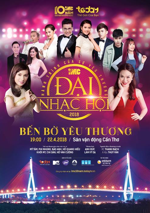 Đêm nhạc đầu tiên với chủ đề “Bến bờ Yêu thương” sẽ diễn ra tại SVĐ Cần Thơ vào lúc 19h00 ngày 22/4. Với chủ đề “Hành trình của sự yêu thương”, Đại nhạc hội IMC 2018 đánh dấu hành trình 10 năm ra đời và phát triển của IMC-TodayTV. Con số đặc biệt “10” cũng là lời chúc tốt đẹp, trọn vẹn cùng sự vươn lên không ngừng mà IMC muốn gửi đến quý khán giả qua chuỗi đại nhạc hội IMC 2018 sẽ được diễn ra tại 4 thành phố lớn gồm: Tp. Cần Thơ, Thủ đô Hà Nội, Tp.Hồ Chí Minh và Tp. Đà Nẵng.