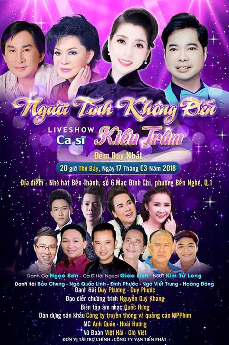 Tintuc - Vào đêm 17 tháng 3 tới đây, nữ ca sĩ Kiều Trâm sẽ tổ chức liveshow "Người Tình Không Đến" tại Nhà hát Bến Thành với sự tham gia của dàn sao đình đám như: Nsut Kim Tử Long, Danh ca Giao Linh, Ngọc Sơn, Danh hài Duy Phương Bảo Chung, Ca sĩ Đình Phước,...