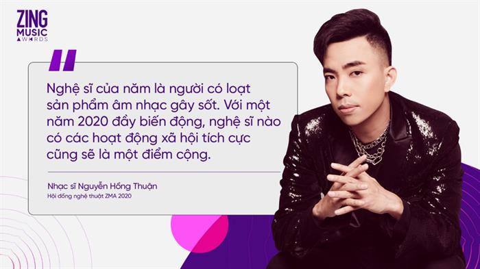 “Thước đo để tôi chọn lựa Nghệ sĩ của năm dựa trên các hoạt động, sản phẩm âm nhạc được đông đảo khán giả yêu mến trong năm. Ngoài ra, với một năm đầy biến động như 2020, nghệ sĩ nào có các hoạt động xã hội tích cực cũng sẽ là một điểm cộng”, nhạc sĩ Nguyễn Hồng Thuận cho biết.