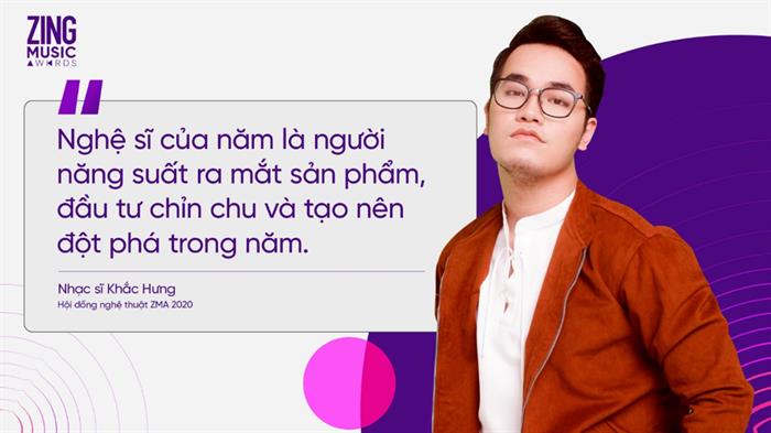 “Nghệ sĩ năng suất ra mắt sản phẩm, đầu tư chỉn chu và tạo nên đột phá trong năm” là các yếu tố để nhạc sĩ Khắc Hưng chấm giải thưởng quan trọng nhất tại ZMA 2020.