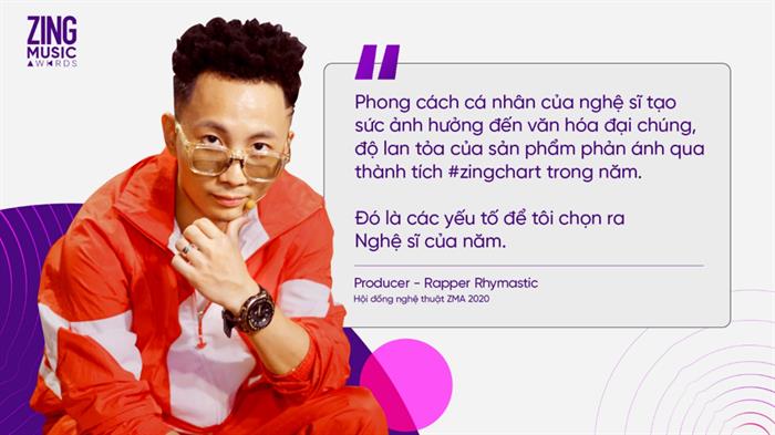 Tiêu chí chấm giải của Rhymastic tại ZMA 2020: “Phong cách cá nhân của nghệ sĩ tạo sức ảnh hưởng đến văn hóa đại chúng, độ lan tỏa của sản phẩm phản ánh qua thành tích #zingchart trong năm. Đó là các yếu tố để tôi chọn ra Nghệ sĩ của năm”.
