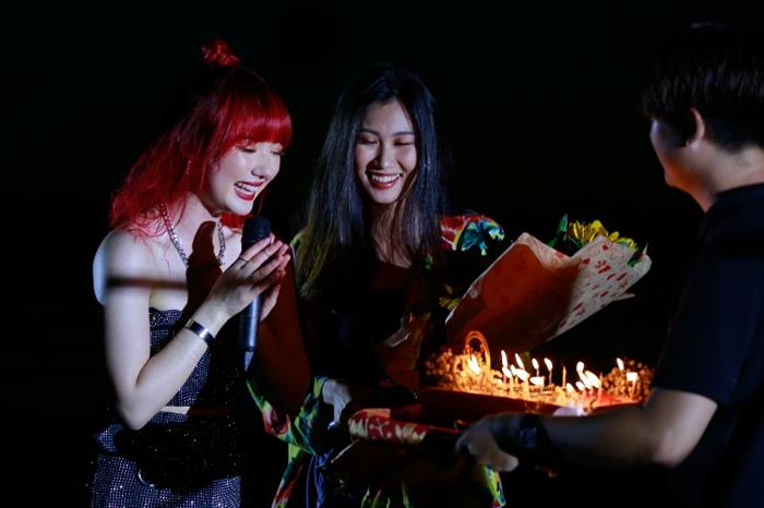 Nữ ca sĩ đã không nén được những giọt nước mắt hạnh phúc khi bất ngờ được chúc mừng sinh nhật trong lần trình diễn tại sự kiện âm nhạc MTV Connection SEA FESTIVAL tối ngày 20/7 tại Khu du lịch Hồ Mây Park, Vũng Tàu.