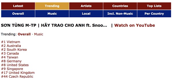 Về top trending, MV “Hãy Trao Cho Anh” của Sơn Tùng M-TP sau 24h đã phủ sóng 10 quốc gia, cụ thể: #1 Vietnam, #2 Australia, #2 South Korea, #3 Canada, #4 Taiwan, #8 Germany, #8 United States, #9 Singapore, #17 United Kingdom, #44 Czech Republic.