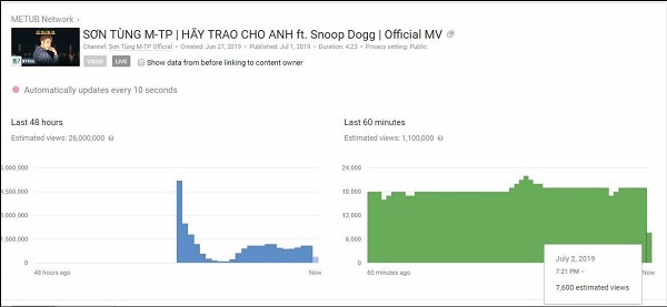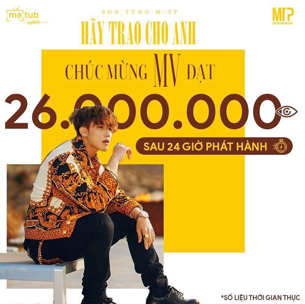 Tròn 24 giờ kể từ khi MV “Hãy trao cho anh” ra mắt, số lượt xem MV “Hãy Trao Cho Anh” được METUB công bố là 26 triệu (tính theo thời gian thực tế). Số liệu này là View realtime tại thời điểm hiện tại được METUB ghi nhận, cập nhật thông qua hệ thống Analytics Realtime của YouTube.