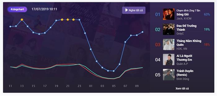 Đồng thời, Sóng gió đã "chạm đỉnh" 7 lần trên #zingchart và trở thành ca khúc đầu tiên của năm 2019 đạt thành tích này. “Chạm đỉnh” #zingchart xảy ra khi lượt nghe trong vòng 1 tiếng vượt qua mốc tiêu chuẩn do Zing MP3 đặt ra. Khái niệm này phản ánh độ quan tâm và sức ảnh hưởng rất lớn của một bài hát trên thị trường. Hơn một năm kể từ Đừng như thói quen, chưa có ca khúc nào "chạm đỉnh" zingchart ngoài Sóng gió. K-ICM cũng trở thành nghệ sĩ đầu tiên của Vpop sở hữu 2 ca khúc từng “chạm đỉnh” #zingchart gồm Buồn của anh (hợp tác cùng Đạt G) và Sóng gió.