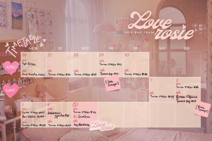 Trước đó, vào sáng ngày 25/4, Thiều Bảo Trâm cũng gây xôn xao mạng xã hội khi đăng tải 43 tấm hình chữ LOVE cùng lúc. Đến sáng ngày 26/4, Thiều Bảo Trâm tiếp tục hẹn khán giả “Save The Date" với poster chỉ có một chiếc nơ hồng cài trên tóc, chính thức thông báo MV Love Rosie sẽ ra mắt vào ngày 5/5. Không chỉ vậy, Thiều Bảo Trâm và ê-kíp còn kỳ công chuẩn bị hẳn một lịch trình comeback bài bản như thần tượng Kpop, tiết lộ từ ngày 26/4 đến 5/5, những mảnh ghép thú vị của MV Love Rosie sẽ lần lượt được gửi tới khán giả.