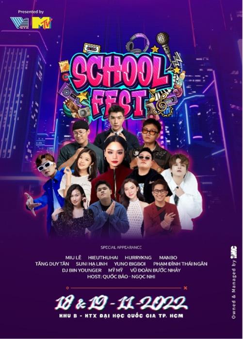 MTV School Fest là sự kiện âm nhạc và giải trí quy mô do MTV Việt Nam phối hợp với Ký túc xá Đại học Quốc gia TP.HCM tổ chức. Sự kiện đầu tiên đã diễn ra xuyên suốt ngày 21/5/2022 vừa qua thực sự tạo nên cơn sốt trong giới trẻ khi thu hút đến hơn 40 nghìn lượt người đến tham gia trải nghiệm. Trong đó đêm nhạc MTV School Fest diễn ra từ 19h00 cùng ngày với sự góp mặt của những tên tuổi rapper, ca sĩ được yêu thích gồm Suboi, Kimmese, Orange, K-ICM, Lona, Rtee, Dương Domic, Long Nón Lá và nhóm nhảy LYRICÍST đã tạo nên dấu ấn khó phai trong lòng người yêu nhạc.