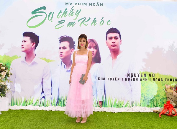 Kim Tuyến điệu đà với váy hồng xếp tầng. Cô đóng vaingười yêu của Nguyên Vũ trong MV quay tại Đà Lạt. Nữdiễn viên nhận xét đàn anh là người chỉn chu, nghiêm túcvà đầy năng lượng trong công việc. Hai người không gặpkhó khăn khi thể hiện các pha tình tứ, thân mật.
