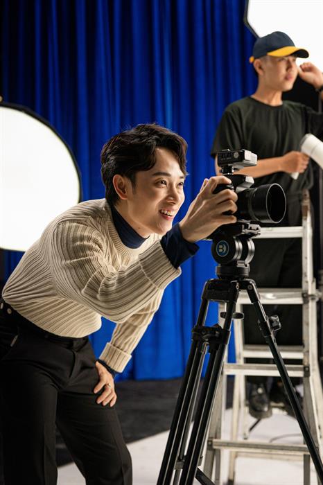 Trúc Nhân đang chăm chú nhìn vào ống kính camera