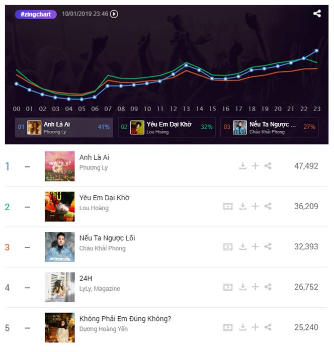 Vừa mới “gây sốt” Vpop cách đây không lâu với bản hit Thằng điên, Phương Ly đã có màn tái xuất trong tuần qua với ca khúc mới mang tên Anh là ai. Đây là sáng tác của Kiên Trần, do JustaTee giữ vai trò sản xuất âm nhạc. Anh là ai tiếp nối thành công của bản hit trước của Phương Ly khi nhận về loạt thành tích nhạc số ấn tượng chỉ trong thời gian ngắn. Ca khúc “đổ bộ” top 10 #zingchart tuần này tại vị trí thứ 8 và bội thu 7 triệu lượt nghe trên Zing MP3. Trên #zingchart real-time, bản hit này đã vươn lên vị trí thống trị và cạnh tranh ngôi vương với Yêu em dại khờ của Lou Hoàng.