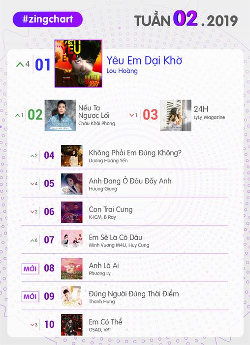 BXH nhạc Việt tuần này cũng chứng kiến màn “đổi chủ” sau 8 tuần dưới sự thống trị của Anh đang ở đâu đấy anh. Yêu em dại khờ tăng 4 hạng để cán đích vị trí quán quân #zingchart tuần này. Hit mới của Lou Hoàng đang vướng nghi án vay mượn ý tưởng ca khúc Sweet dream của Jang Nara. Tuy nhiên với giai điệu bắt tai cùng ca từ dễ nhớ, dễ thuộc, Yêu em dại khờ vẫn nhận được sự quan tâm của người nghe và không ngừng “làm mưa làm gió” trên đường đua Vpop. Ngôi vương #zingchart tuần sau trở nên khó đoán hơn bao giờ hết khi Yêu em dại khờ và Anh là ai liên tục thay phiên nhau vươn lên hạng nhất #zingchart real-time. Điều này cho thấy thị trường nhạc Việt đầu năm 2019 đang trở nên vô cùng sôi động.