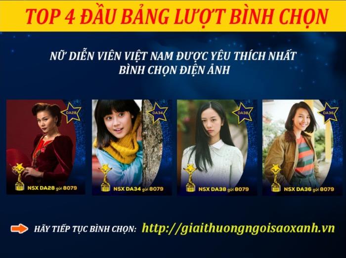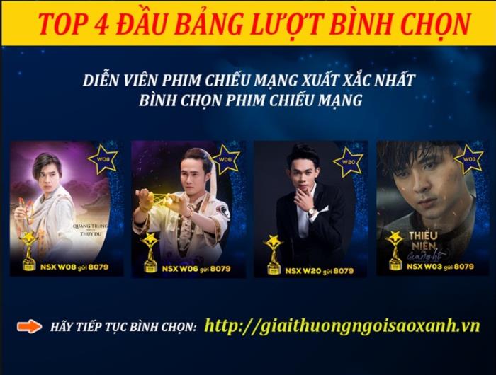 Tiếp tục bình chọn cho tác phẩm và nghệ sĩ yêu thích tại giaithuongngoisaoxanh.vn hoặc soạn tin: NSX (khoảng trắng) MÃ SỐ BÌNH CHỌN gửi 8079, để có cơ hội nhận được những phần thưởng giá trị từ ban tổ chức.