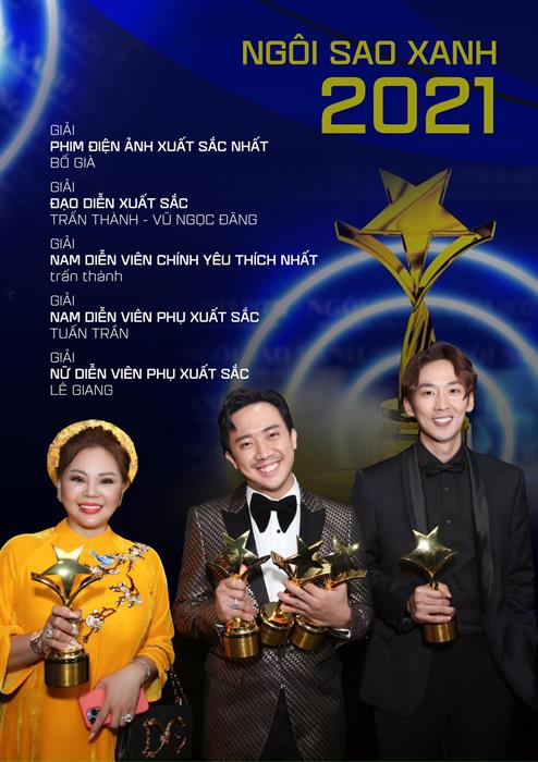 Tintuc - Tại lễ trao giải Ngôi sao xanh 2021, Bố già đã thắng giải Phim điện ảnh hay nhất. Các diễn viên gồm Trấn Thành Tuấn Trần, Lê Giang và đạo diễn Vũ Ngọc Đãng cũng mang về các giải thưởng cá nhân danh giá.