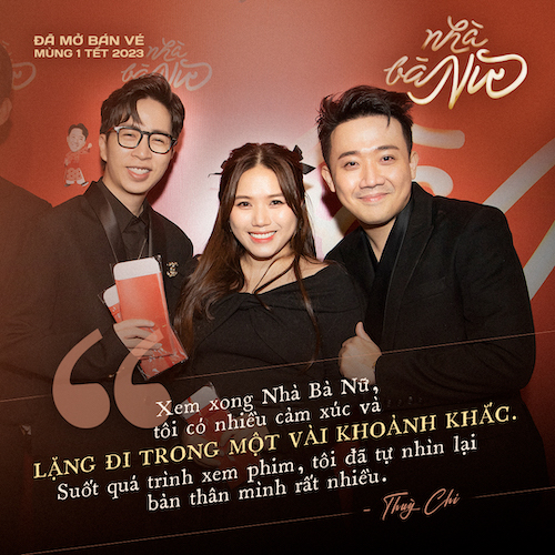 Thuỳ Chi cũng dạt dào cảm xúc: “Xem xong “Nhà Bà Nữ” tôi có nhiều cảm xúc suy ngẫm lại bản thân mình và lặng đi một vài khoảnh khắc. Nói chung, trong quá trình xem phim, tôi tự nhìn lại bản thân mình rất nhiều”.