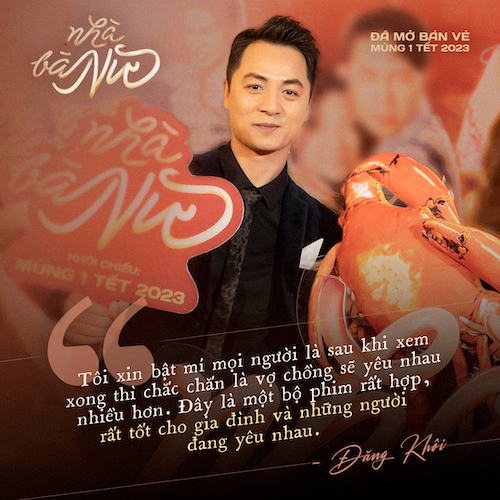 Đăng Khôi trình bày: “Tôi mới xem xong “Nhà Bà Nữ”, hai vợ chồng quá xúc động vì phim quá hay. Tác phẩm đưa chúng tôi đến nhiều cung bậc cảm xúc, từ vui buồn đến khóc theo anh Trấn Thành cũng như tất cả các nhân vật. Vợ chồng tôi rất biết ơn vì là những khán giả đầu tiên xem phim. Tôi xin bật mí mọi người là sau khi xem xong thì chắc chắn là vợ chồng tôi sẽ yêu nhau nhiều hơn. Đây là một bộ phim rất hợp, rất tốt cho gia đình và những người đang yêu nhau. Mọi người đến ủng hộ nhà “Nhà Bà Nữ” nhé vì đây là một bộ cực kỳ cực kỳ hay. Tôi chắc chắn sẽ đặt vé cho gia đình, nhân viên công ty xem phim”.