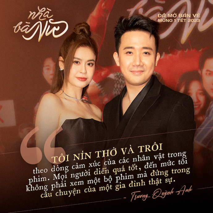 Trương Quỳnh Anh: “Tôi đã khóc khi xem “Nhà Bà Nữ”. Không biết là anh Trấn Thành có theo dõi các câu chuyện của tôi hay không, nhưng có một phần câu chuyện của tôi ở trong đó. Nhiều khi tôi nghĩ bản thân đã gác lại mọi việc, nhắc lại không còn thấy đau nữa, nhưng không hiểu sao khi bộ phim kể về câu chuyện của nhân vật Nhi hay các thành viên trong “Nhà Bà Nữ” thì tôi không kiềm được xúc động. Những lời tự sự của Nhi làm tôi cảm thấy đau lòng rất nhiều. Không phải vì tôi thấy được một phần hình ảnh của mình trong phim, mà vì cách kể chuyện “Nhà Bà Nữ” của anh Trấn Thành, diễn xuất của dàn diễn viên… đến hình ảnh làm tôi nhận ra đây là một bộ phim rất đáng xem trong dịp Tết này. Mỗi thành viên trong gia đình khi xem “Nhà Bà Nữ” sẽ nhận ra cách cư xử, yêu thương đúng cách người thân để mọi người đều cảm thấy hạnh phúc. Chúc anh Thành và ê kíp “Nhà Bà Nữ” sẽ được khán giả đón nhận trong mùa Tết năm nay”.