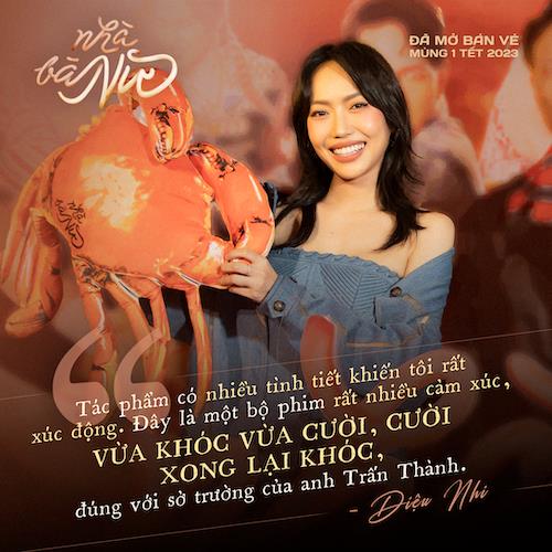 Diệu Nhi chia sẻ: “Thật sự là từ đầu đến giữa phim tôi cười rất đã, rất thoải mái luôn. Các mảng miếng rất vui, rất đời. Sau đó, tác phẩm có nhiều tình tiết khiến tôi rất xúc động. Tôi nghĩ khán giả khi xem phim sẽ cảm thấy mình ở đâu đó trong những nhân vật trong gia đình này và xung quanh họ. Đây là một bộ phim rất nhiều cảm xúc, vừa khóc vừa cười, cười xong lại khóc, đúng với sở trường của anh Trấn Thành. Chúc “Nhà Bà Nữ” sẽ thành công trong dịp Tết này và hi vọng mọi người ủng hộ phim nha”.