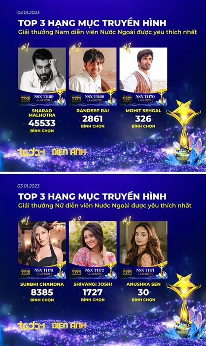 Ngoài đề cử Việt, Ngôi Sao Xanh còn dành sự vinh danh cho các nghệ sĩ, bộ phim nước ngoài nổi bật, được khán giả yêu thích. Nam/ Nữ diễn viên Ấn Độ Sharad Malhotra và Surbhi Chandna đang dẫn trước ở giải Nam/ Nữ diễn viên nước ngoài được yêu thích nhất. Cùng với đó phim truyền hình Ấn Độ – Xà nữ tái sinh cũng có cơ hội trở thành Phim nước ngoài được yêu thích nhất với 3.399 vote. Đặc biệt, Sharad Malhotra và Surbhi Chandna sẽ có chuyến đến Việt Nam vào ngày 05/01 và 06/01 sắp tới để tham dự gala trao giải và giao lưu cùng người hâm mộ.