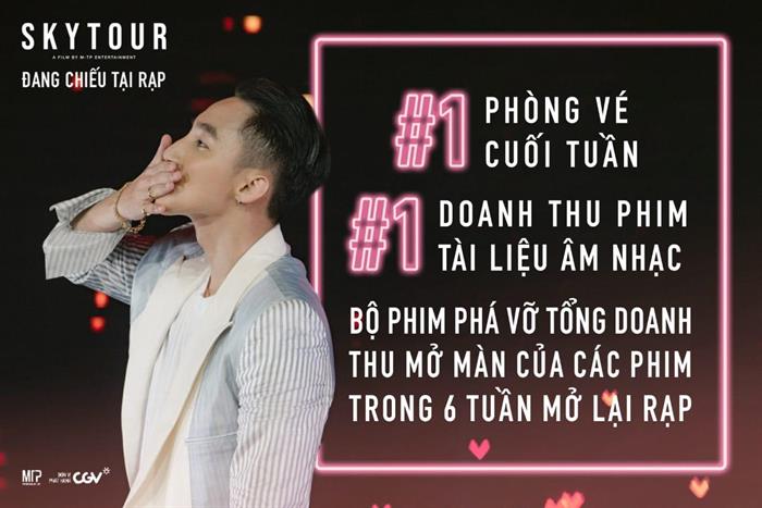 Hiện tại, phim tài liệu âm nhạc SKY TOUR Movie vẫn đang tiếp tục công chiếu tại các cụm rạp trên cả nước. Bộ phim mang đến cho khán giả những góc nhìn mới về Sơn Tùng M-TP trong âm nhạc, công việc và cuộc sống. Với vai trò là Chủ tịch công ty M-TP Entertainment, Sơn Tùng M-TP đã dành rất nhiều thời gian để miệt mài cùng các cộng sự của mình tạo nên sự kiện âm nhạc lớn nhất năm 2019. Bên cạnh đó, SKY TOUR Movie cũng hé lộ cả quá trình hậu trường - nơi đội ngũ M-TP Entertainment cùng nhau chinh phục giấc mơ về một sân khấu hoành tráng, mãn nhãn mang tên SKY TOUR.