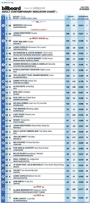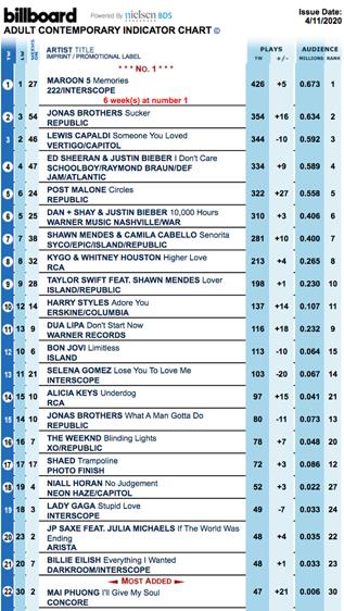 (Billboard Adult Contemporary Indicator Chart là BXH được tổng hợp hàng tuần bởi tạp chí Billboard nhằm liệt kê các bài hát phổ biến nhất trên các đài phát thanh đương đại dành cho những người thành niên tại Hoa Kỳ. BXH uy tín này lần đầu tiên ra mắt công chúng vào ngày 17.07.1961).