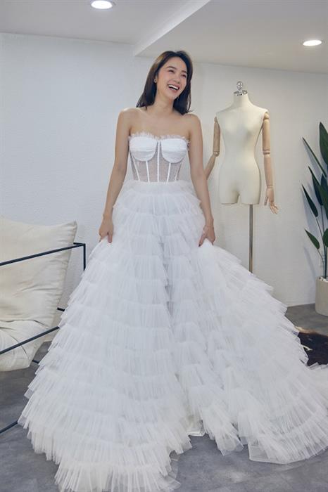 Đáng chú ý, Huy Trần là 1 trong 2 nhà thiết kế Việt Nam duy nhất phụ trách phần váy cưới cho Minh Hằng. Nhà thiết kế còn lại cũng là một tên tuổi đình đám tại làng mốt Việt Nam. Sản phẩm của nhà thiết kế Huy Trần được Minh Hằng diện trong lúc chụp ảnh cưới. Trong loạt ảnh thử váy cưới, sao phim “Bẫy ngọt ngào” khoe vẻ đẹp ngọt ngào, duyên dáng.