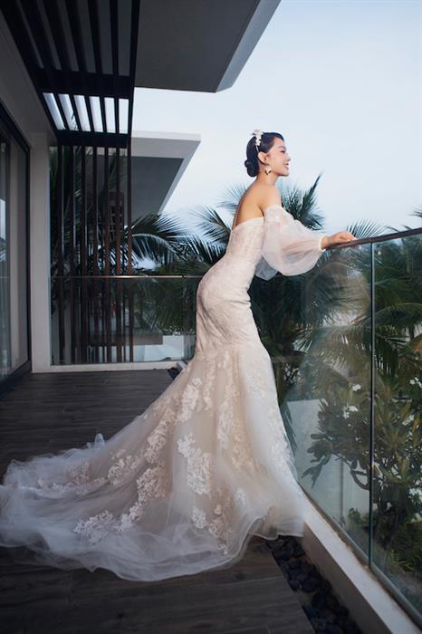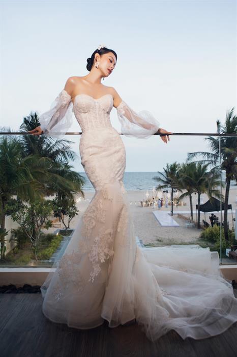 “Cô dâu tháng 6” Minh Hằng còn kết hợp với tay áo voan thêu hoa giá 590 USD (14 triệu đồng) giúp tổng thể quyến rũ khó rời mắt. Họa tiết hoa hồng trên toàn bộ váy và phụ kiện là tác phẩm thủ công hoàn mỹ của nhà mốt Anne Barge. Đáng chú ý, Olivia cũng là hãng đã đem bộ váy cưới này về cho Minh Hằng.