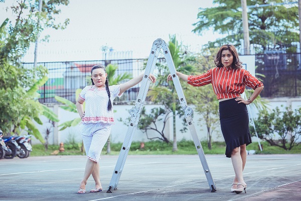 Dường như lần hợp tác đầu tiên đầy thuận lợi nên hai diễn viên trò chuyện với nhau rất vui vẻ. Bộ đôi “oan gia bà chủ – osin” nhanh chóng bắt nhịp, tạo những tư thế chụp ảnh hài hước với đạo cụ là chiếc thang. Khác hẳn với hình tượng trong Chuyện Gia Đình Vàng, ngoài đời hai diễn viên “lầy lội” này thích chọc ghẹo đồng nghiệp và ê-kíp đoàn phim.