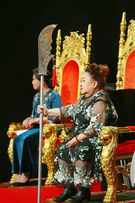 Theo sau là thanh kiếm được chính tay NSND Bạch Tuyết gửi trao đến Thy Nhung. Không hề lép vế hai chàng trai, giọng ca “Chuông Bạc Vọng Cổ” vẫn nhập vai nữ anh hùng mượt mà qua từng câu hát, từng biểu hiện cảm xúc trên gương mặt.