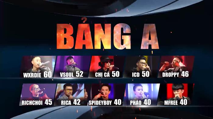 Bảng A: Wxrdie (60 like), Vsoul (52 like), Chị Cả (50 like), ICD (50 like), Droopy (46 like), RichChoi (45 like), Rica (42 like), Spideyboy (40 like), Pháo (40 like) và Mfree (40 like).