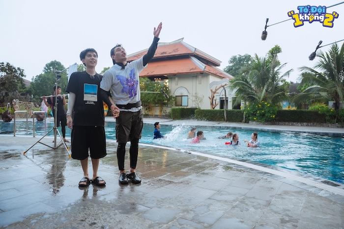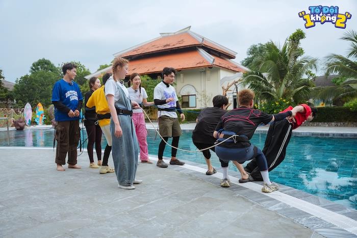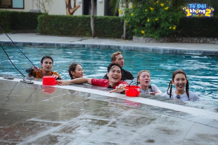 Tiếp tục câu chuyện trò chơi ở khu vực hồ bơi, dù chưa rõ thử thách nào sẽ chào đón các thành viên nhưng dường như bộ đôi tách rời Dương Lâm – Quang Hùng vẫn đang chiếm ưu thế. Sau màn “xử phạt” Võ Tấn Phát thì bằng một cách nào đấy, 3 khách mời Huỳnh Lập – Tiêu Minh Phụng – Phương Mỹ Chi cũng “dính bẫy” của Diễm mà rơi thẳng xuống hồ bơi.
