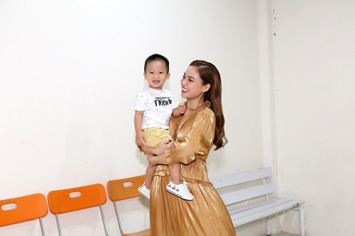 Trong hậu trường, ông xã Xuân Văn luôn bên cạnh để chăm sóc Giang Hồng Ngọc cho đến khi cô bước lên sân khấu. Anh giúp vợ mang giày, chỉnh trang phục, chăm sóc con trai và ngồi lặng lẽ dưới sân khấu theo dõi vợ ghi hình.