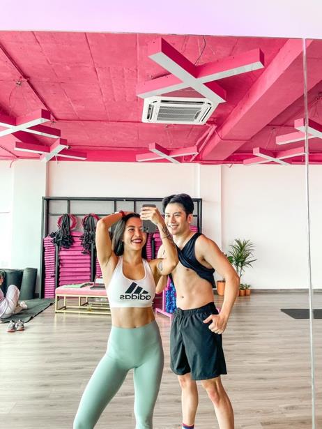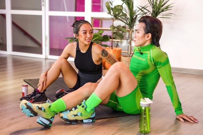 Dù có bụng 8 múi và chăm chỉ tập gym nhưng Call Me Duy vẫn khá mệt với các bài tập cùng Hana Giang Anh.