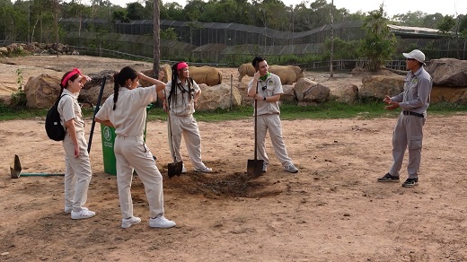 Thảo Nhi Lê và Dino Vũ trải nghiệm lần đầu dọn chuồng tê giác tại Safari