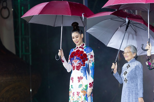 Mặc dù điều kiện thời tiết không tốt, BTC đã chu đáo chuẩn bị phương án dự phòng để chương trình diễn ra suôn sẻ. Cùng với các Đại sứ khác, Hoa hậu Khánh Vân xuất hiện rạng rỡ trên sân khấu với chiếc ô trên tay. Cô liên tục nở nụ cười, chào hỏi Nghệ sĩ Ưu Tú Phi Điểu đứng bên cạnh. Nếu như ở sự kiện họp báo cách đây vài ngày, cô diện bộ áo dài cách điệu thì trong lễ khai mạc, cô chọn mặc bộ áo dài đính hạt, hoạ tiết về nghệ thuật truyền thống dân tộc. Đây cũng là dịp hiếm hoi người đẹp sử dụng son môi đỏ cho layout make up, kết hợp tóc búi cao.