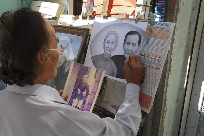 Những bức tranh của chú không những diễn tả dấp dáng, đường nét của khuôn mặt mà còn thể hiện được thần thái, tâm trạng của nhân vật. Cả đôi mắt, cái nhoẻn miệng cười hay từng biểu cảm đều được chú khắc họa rõ nét. Hàng ngày, tại sạp vẽ nhỏ của mình trên con đường Điện Biên Phủ quận 10, cứ 8 giờ sáng chú lại dọn giá vẽ, tá bút được tự chế bằng tre, bông và thậm chí là lông chổi, đầu lọc thuốc lá; đúng 5 giờ chiều thì dọn về. Mỗi lần vẽ, chú đều rất nhập tâm như thể đưa hồn vào bức tranh, mặc kệ mọi sự việc xung quanh.
