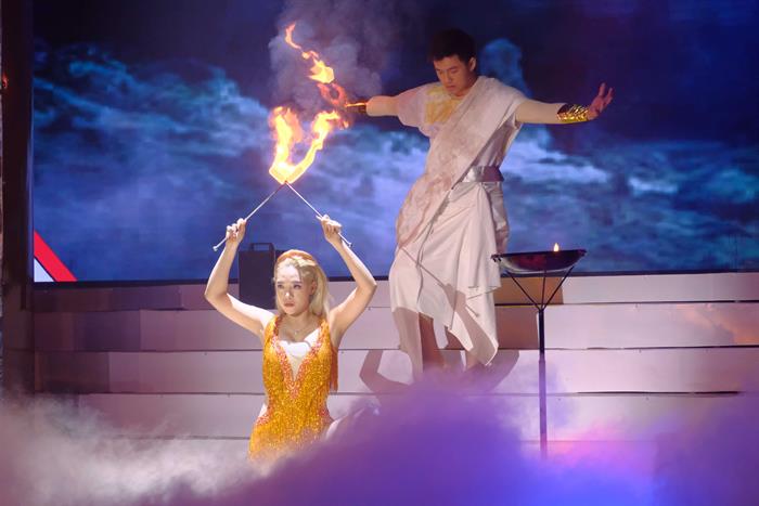 Tiếp theo là tiết mục múa lửa đến từ cô nàng Mỹ Kim – nghệ sĩ múa lửa hiếm hoi thành công. Sinh ra trong một gia đình giàu truyền thống cải lương, ông nội là NSƯT Hùng Minh, ba và 2 anh trai từng có thời gian đi hát cải lương, Mỹ Kim có niềm đam mê nghệ thuật từ bé. Xuất hiện với tạo hình nữ thần đầy nóng bỏng không kém phần quyền lực, Mỹ Kim đã “thiêu rụi” sân khấu Kỳ Tài Tranh Đấu bằng tài năng của mình. Từ nuốt và giữ ngọn lửa trong miệng đến liếm lửa, vuốt lửa, lắc vòng lửa, Mỹ Kim chinh phục hoàn toàn khán giả và ban giám khảo.