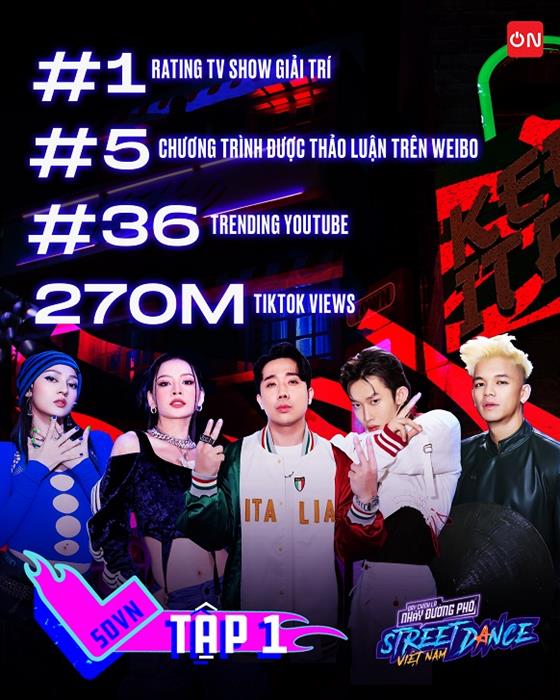Chương trình nhận được nhiều thành tích ấn tượng như: Top 1 TV Rating; Top 5 chương trình được thảo luận nhiều nhất trên Weibo; Top 36 Trending Thịnh hành YouTube; Hơn 270 triệu TikTok views. Đồng thời, Street Dance Việt Nam còn lọt Top 15 Từ khóa được tìm kiếm nhiều nhất và hơn 10 triệu lượt tìm kiếm trên Weibo.