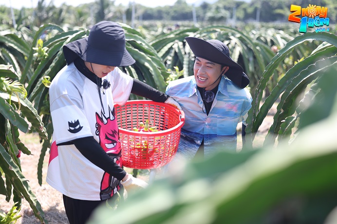 Xuất hiện tại vườn thanh long thuộc tỉnh Bình Thuận, dàn cast 2 Ngày 1 Đêm cùng 2 khách mời hoa hậu Khánh Vân và diễn viên Tam Triều Dâng đã hóa thân thành những người nông dân hái thanh long dưới thời tiết “gió như phang, nắng như rang”.