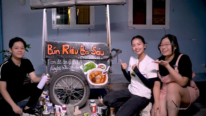 Ngọc Châu và nhóm vẽ Hạnh Phúc đã cùng nhau gửi tặng món quà đặc biệt cho xe bún riêu của cô Huệ – trang trí lại xe bún riêu như một biển hiệu riêng biệt. Suốt hơn 3 tiếng miệt mài và hăng say, Ngọc Châu cùng hai người bạn của nhóm vẽ Hạnh Phúc đã mang đến diện mạo mới cho xe bún. Những màu sắc mới với cái tên “Bún Riêu Bà Sáu”, cùng câu slogan “Con đã ăn gì chưa, đừng bỏ bữa con nhé” do chính Ngọc Châu và nhóm vẽ Hạnh Phúc cùng nhau lựa chọn để vẽ lên với mong muốn truyền đi thông điệp tích cực đến khách hàng của bà Sáu Hường.